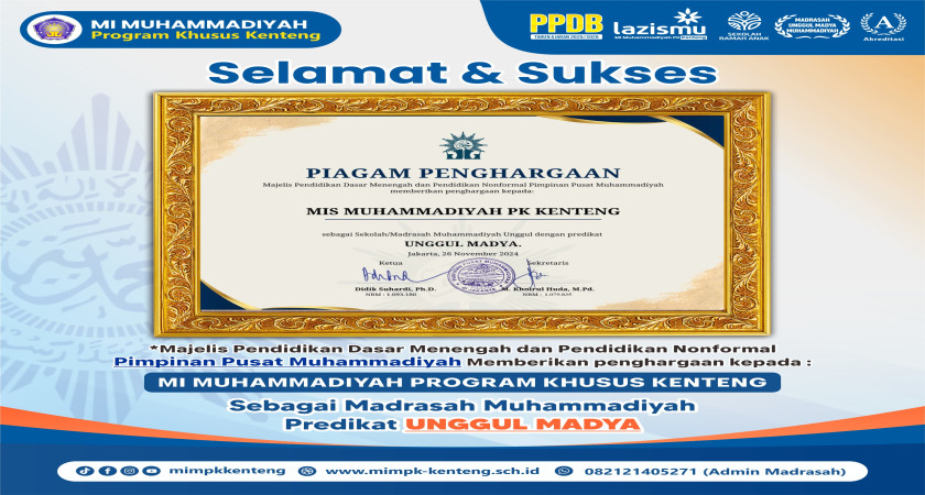 Alhamdulillah dengan izin Allah SWT, MI Muhammmadiyah Program Khusus Kenteng meraih penghargaan sebagai Madrasah Unggul Madya dari Majelis Pendidikan Dasar dan Pendidikan Nonformal Pimpinan Pusat Muhammadiyah. Dengan predikat "Unggul Madya", madrasah ini menunjukkan keunggulan dalam berbagi aspek pendidikan dengan standar Muhammadiyah. Penghargaan ini mencerminkan dedikasi madrasah untuk membangun kualitas pendidikan yang berbasis Islami dengan mengedepankan akhlakul karimah. Penghargaan ini juga sebagai bukti kerja keras para guru, siswa dan semua warga madrasah. Semoga penghargaan ini menjadi motivasi MI Muhammadiyah Program Khusus Kenteng untuk terus berkembang menjadi lebih baik sebagai sarana membentuk generasi emas yang sholih sholihah.